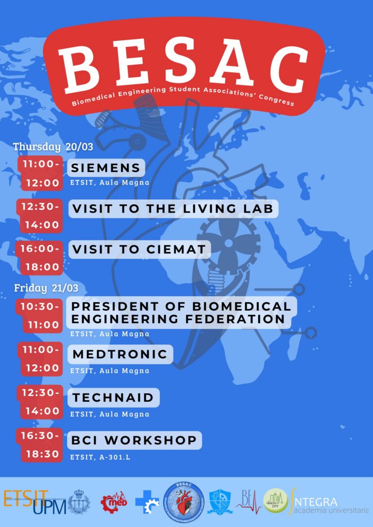 Los días 20 y 21 de marzo 2025 CEEIBIS-UPM dará inicio a una primera edición del Biomedical Engineering Student Associations’ Congress (BESAC), que contará con la participación de asociaciones de ingeniería biomédica de universidades de diferentes países como BEA (Biomedical Engineering Association del Politecnico di Milano), FSI MedTech (de la Universidad de Erlangen-Núremberg) y MED (Medical Engineering Develepoment de la Politécnica de Bucarest).